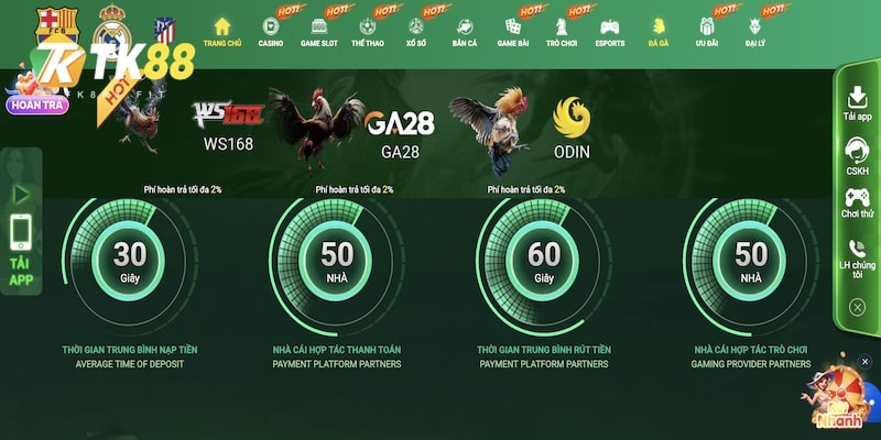 - Sảnh game chuyên nghiệp: Để thực hiện mục tiêu trở thành trang web đặt cược an toàn nhất, TK88 đã hợp tác với nhiều nhà phát triển. Gồm có WS168 và AOG, hứa hẹn cung cấp nhiều trận đấu chất lượng.